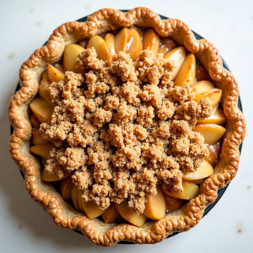 - Espolvorea el crumble por encima de la mezcla de manzanas, asegurándote de cubrirlas completamente.