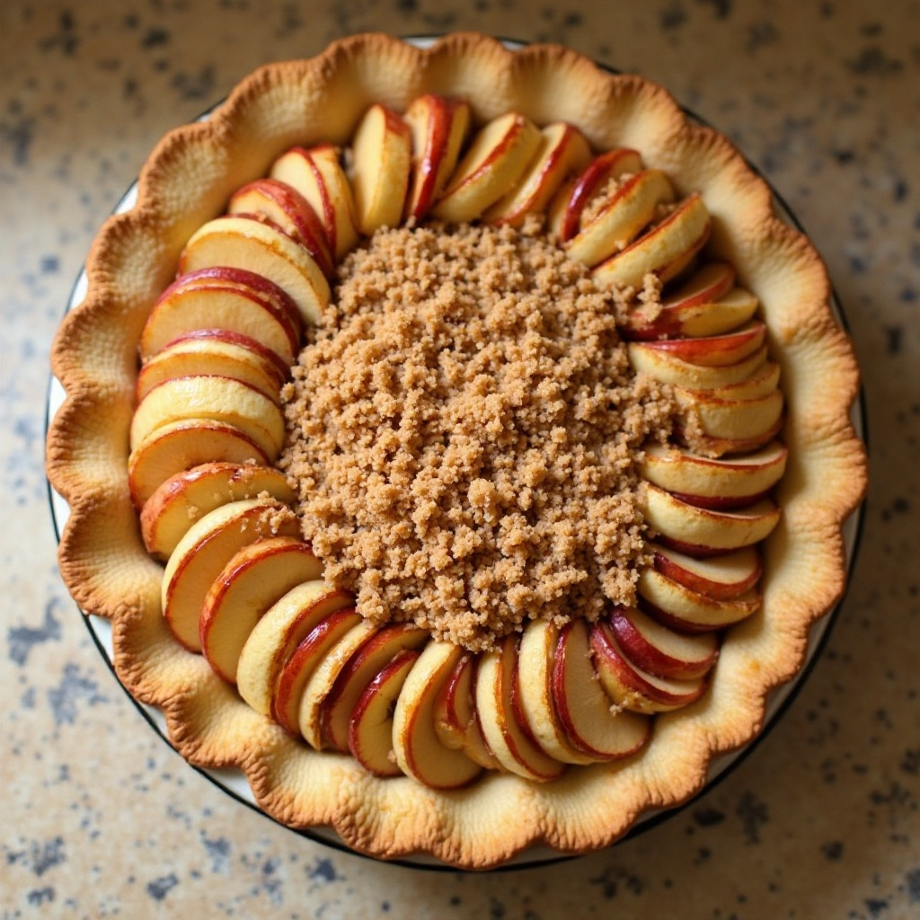 - Distribuye el crumble uniformemente sobre las manzanas cubiertas con caramelo, asegurándote de que la capa sea lo suficientemente gruesa para proteger las frutas durante la cocción.