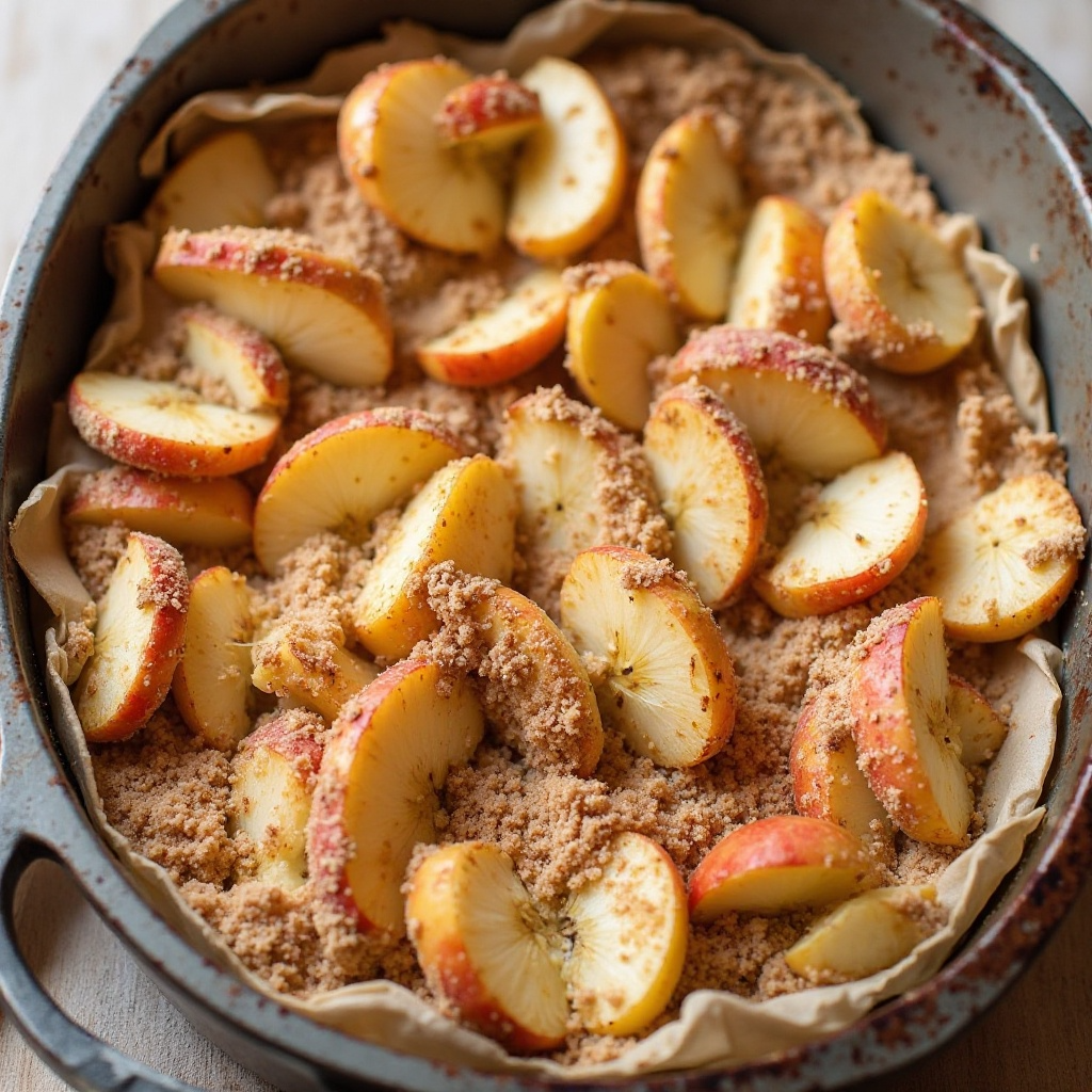 - Coloca la mezcla en la bandeja preparada y hornea durante 30-40 minutos, o hasta que las manzanas estén tiernas y la masa esté dorada. Sirve caliente o frío.