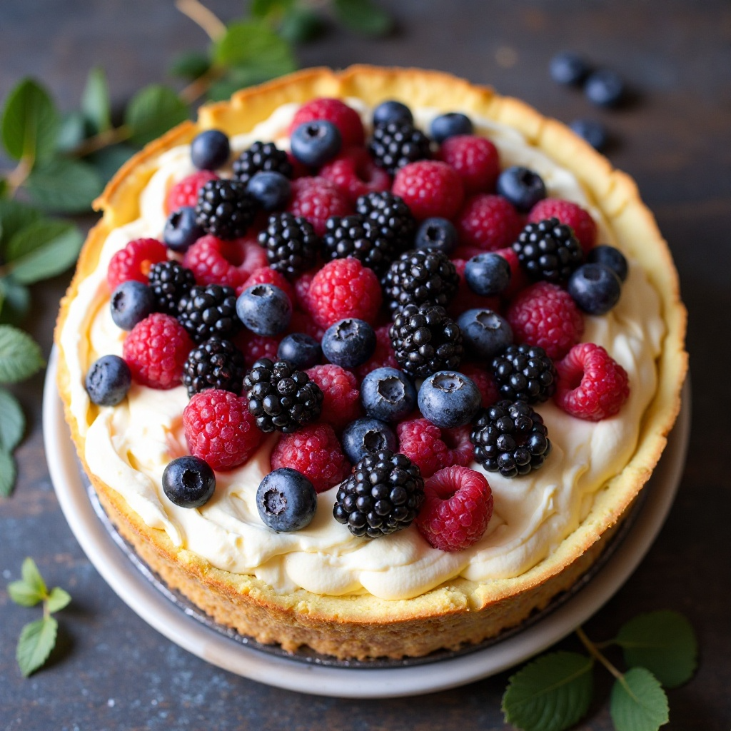 - Coloca las frutas del bosque en la parte superior de la tarta, dejando un borde alrededor sin cubrir para evitar que se quemen.