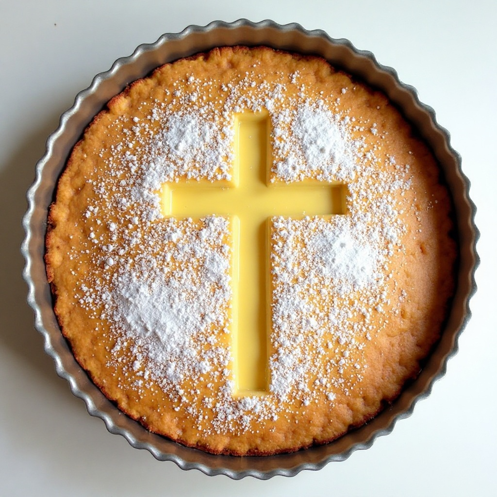 - Para decorar, coloca una plantilla de la Cruz de Santiago en el centro y espolvorea con azúcar glas. Retira la plantilla con cuidado para que el dibujo quede marcado.