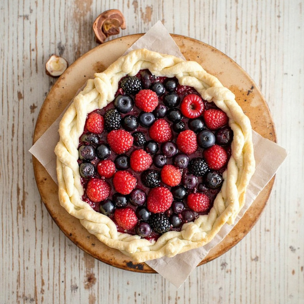 6. Coloca el hojaldre en la bandeja y rellena con las frutas mezcladas, dejando un borde limpio alrededor del hojaldre.