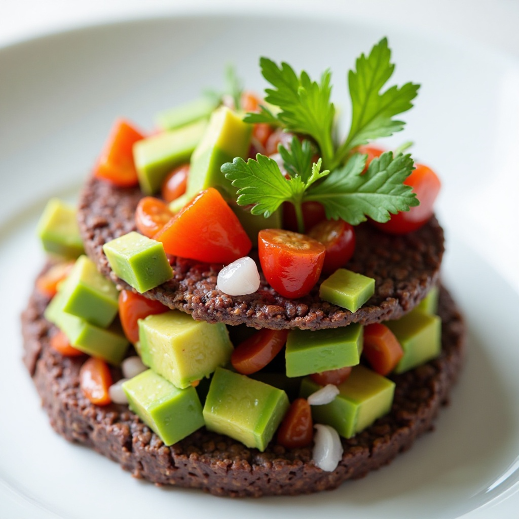 - Monta el tartar: coloca las rodajas de chocolate en capas alternas con los ingredientes del guacamole y de la mezcla de pimientos, asegurándote de mantener las rodajas de chocolate en la parte superior o de las capas más visibles.