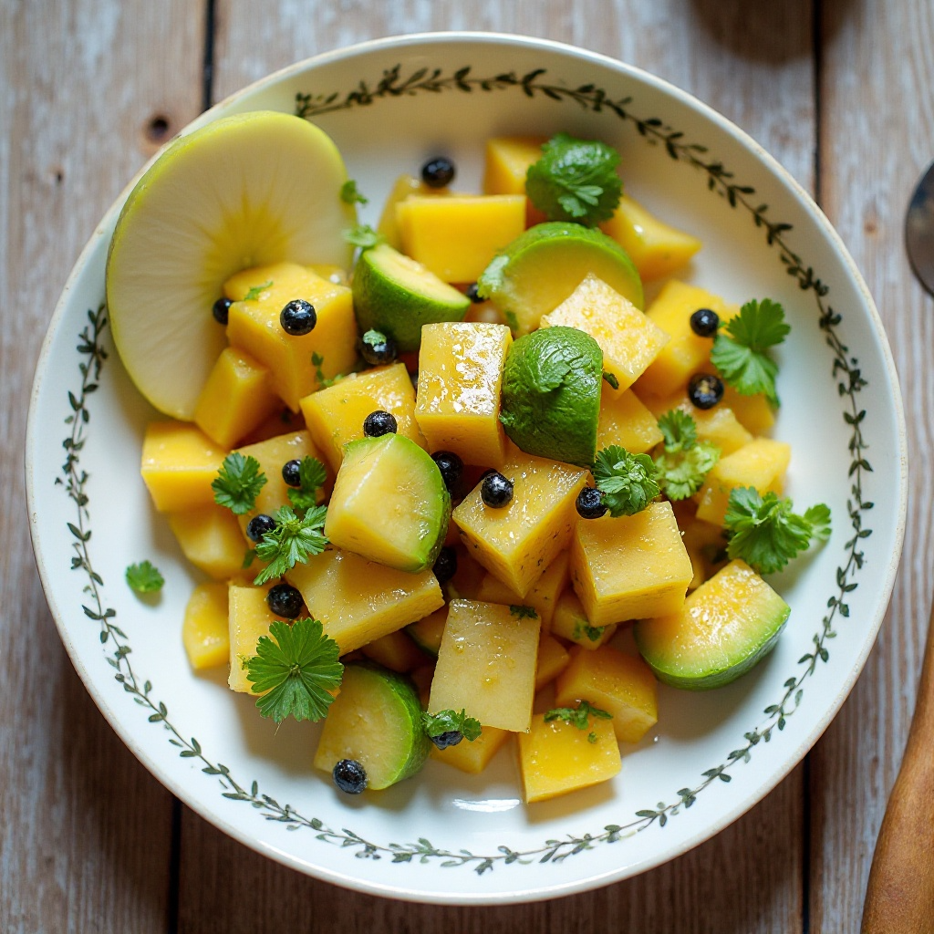 Este plato es una excelente fuente de vitaminas y antioxidantes, gracias a las frutas utilizadas. La piña es rica en vitamina C, la manzana contiene fibra, y el aguacate ofrece grasas saludables. La elección de mostaza di frutta como aderezo puede añadir un beneficio para el sistema digestivo debido a su contenido de ácidos grasos omega-3. Este plato es ligero y bajo en calorías, perfecto para cualquier momento del día.