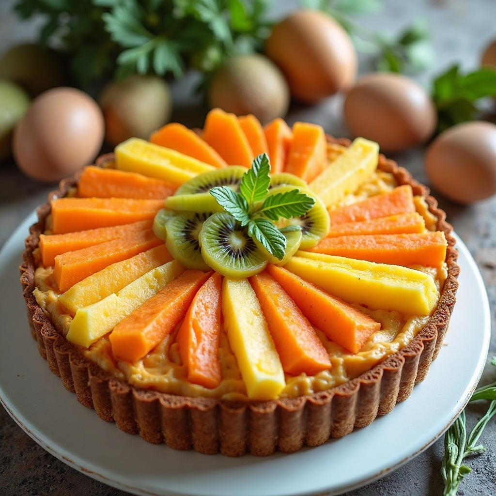 Esta tarta está elaborada con frutas tropicales ricas en vitaminas C y antioxidantes, lo que la convierte en una opción saludable para aquellos que buscan disfrutar de algo dulce sin exceso de calorías. La harina integral aporta fibra, y el mango y la piña son bajos en calorías y altos en nutrientes, siendo excelentes opciones para incluir en dietas equilibradas.