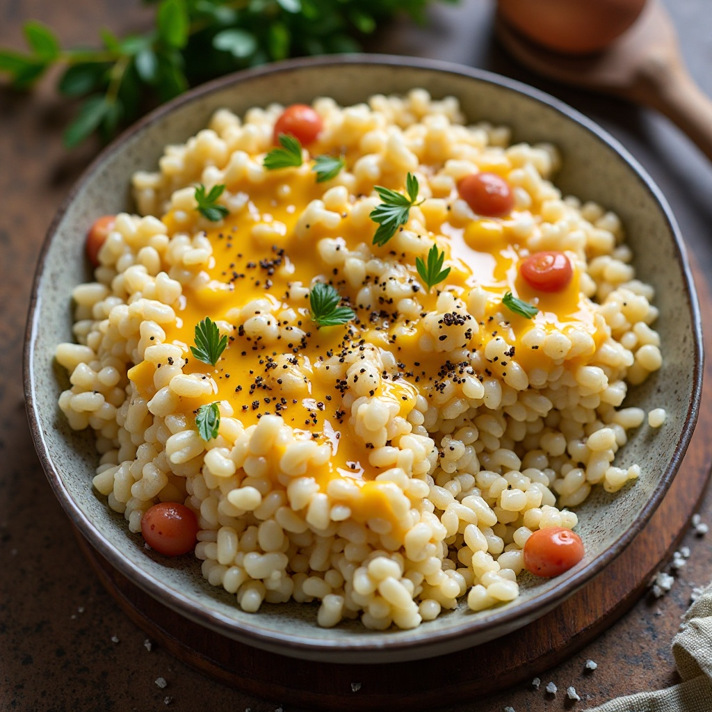2. Baja el fuego a medio-bajo, agrega los huevos, mezcla bien para evitar que se cocinen rápidamente. Luego añade el queso fresco y mezcla continuamente hasta que el queso se derrita y se mezcle con el arroz y los huevos.