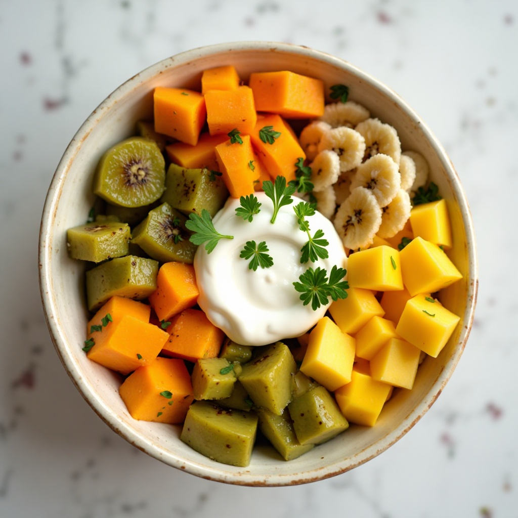 Micronesia es conocida por su abundancia de frutas tropicales, muchas de las cuales son parte integral de su dieta tradicional. Los platos como este tazón reflejan la importancia de aprovechar los recursos naturales disponibles localmente. En Micronesia, compartir alimentos frescos y sabrosos como este tazón no solo nutre el cuerpo, sino que también fortalece los lazos comunitarios, enfatizando la conexión con la tierra y el mar.
