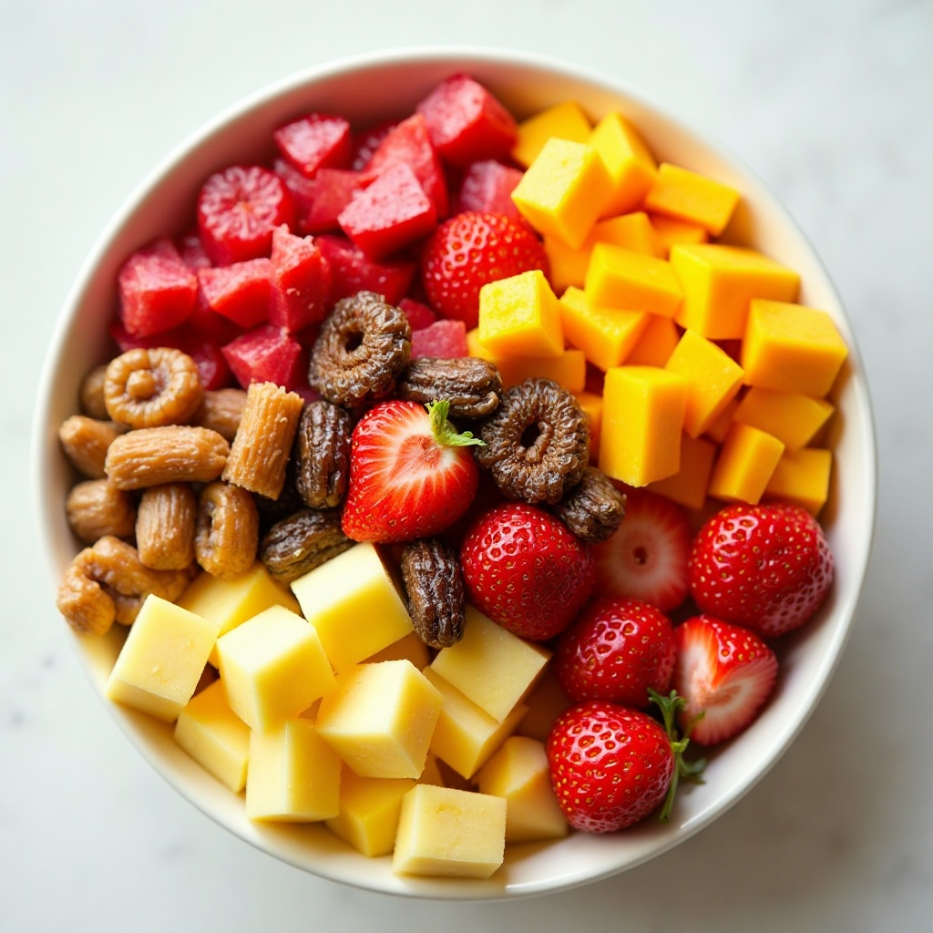 - En un tazón grande, mezcla las frutas tropicales, la piña y las fresas.