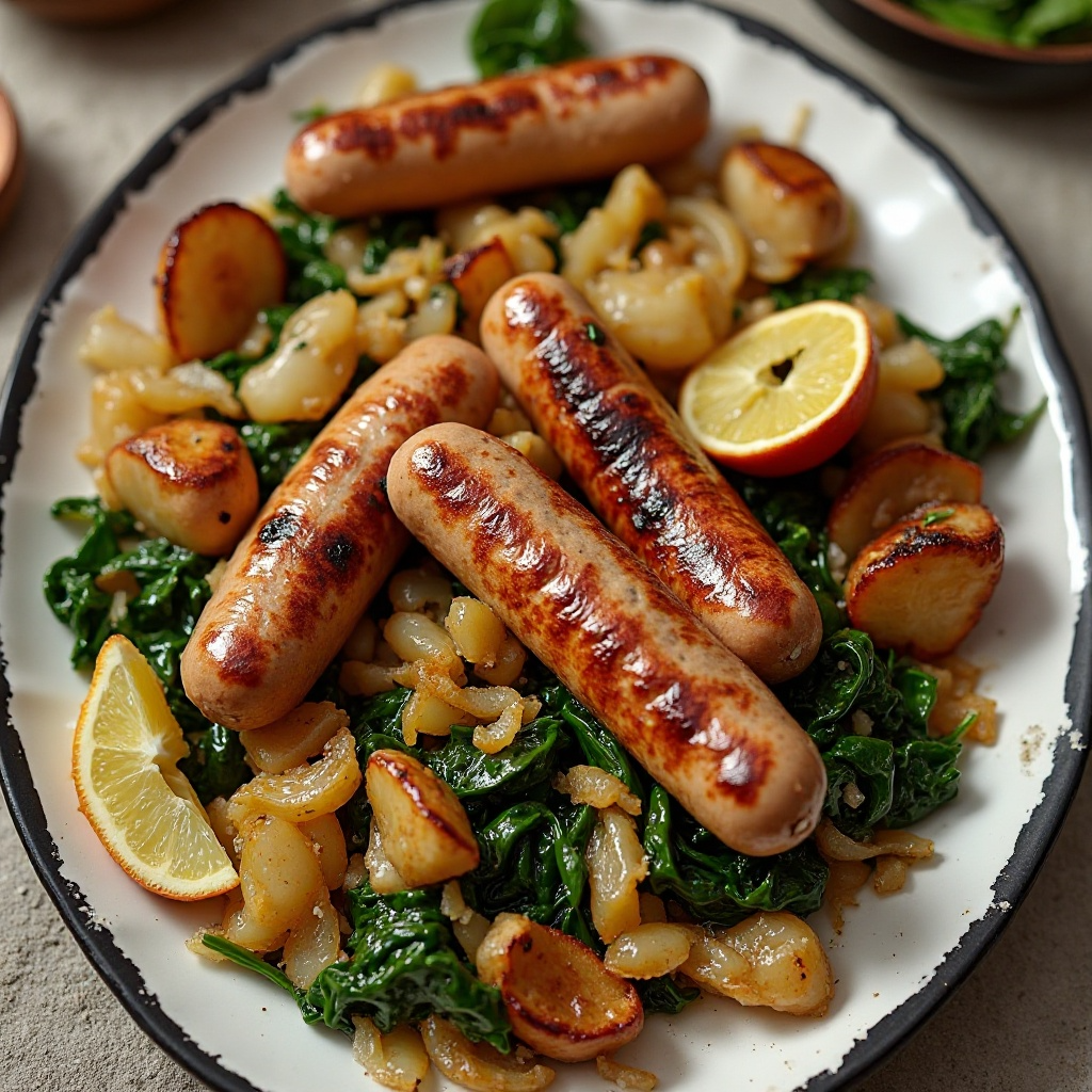 La Thüringer Rostbratwurst es rica en proteínas y nutrientes esenciales. Las espinacas son una fuente de hierro y fibra, mientras que el sauerkraut contribuye con vitaminas del complejo B y ácidos grasos omega-3. Es importante controlar la cantidad de sal para aquellos con condiciones cardiovasculares. El limón añade un toque fresco y ayuda a digerir los alimentos.