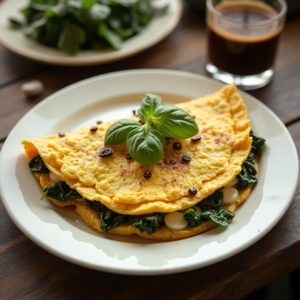 Este omelette es una opción rica en proteínas y fibra, gracias al huevo y las espinacas. El café utilizado, un ingrediente clave, ofrece antioxidantes y puede mejorar la concentración. Si tienes sensibilidad a los lácteos, puedes omitir el queso fresco o ricotta.