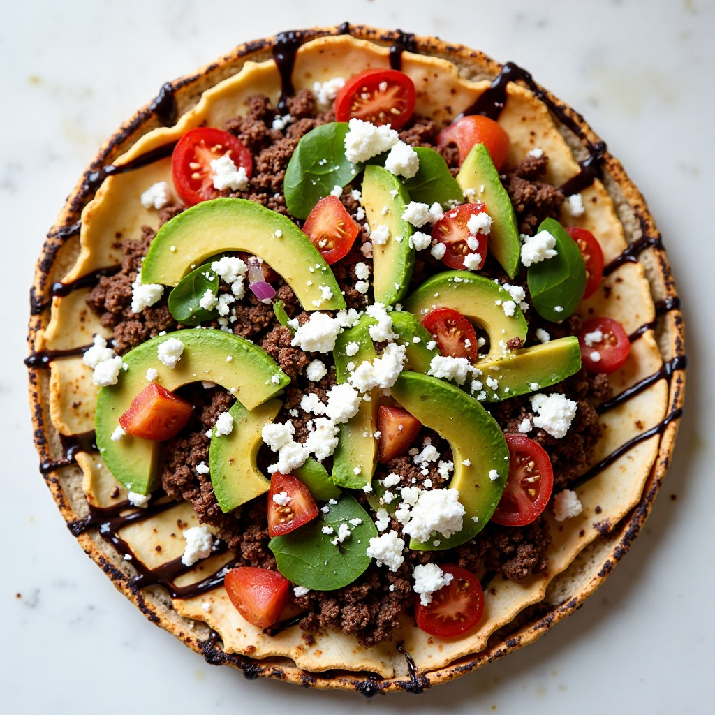 Esta receta incorpora el mezcal, que es una bebida fermentada a partir de la agave, conocida por su perfil de antioxidantes. Las tlayudas son una opción versátil y saludable cuando se prepara con ingredientes frescos como el tomate y el aguacate. La carne molida puede ser un excelente fuente de proteínas si se elige magra y se cocina adecuadamente.
