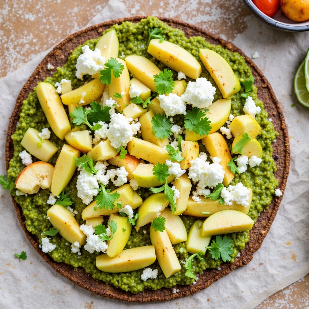 Las tlayudas son un tipo de tortilla originaria del estado de Oaxaca, en México, y se sirven como un plato principal o una entrada. Esta versión, inspirada en San Andrés Calpan, incorpora manzanas y peras para añadir dulzura y contraste con la salsa de chile verde picante, típica en muchas recetas mexicanas.