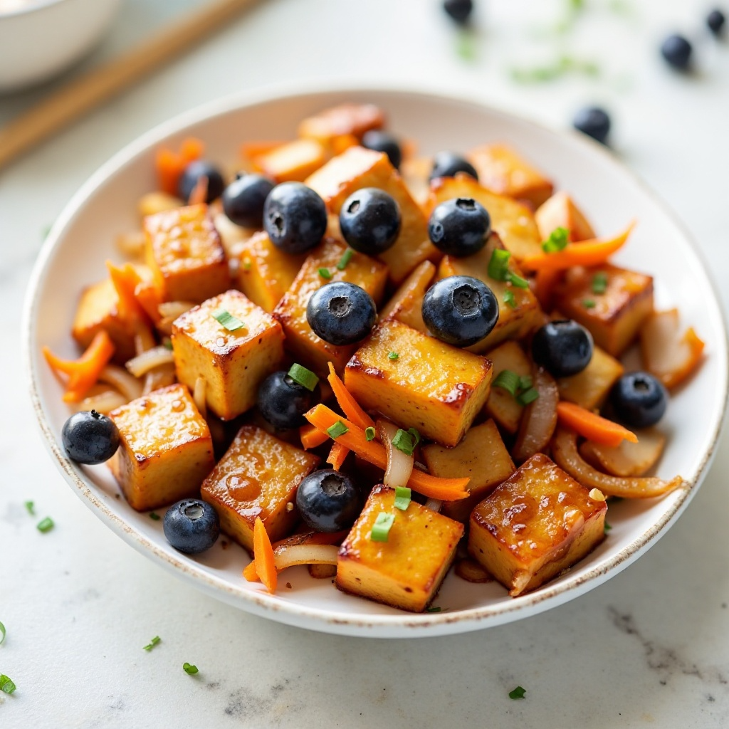 Este plato es bajo en calorías y alto en proteínas vegetales gracias al tofu. La salsa teriyaki casera puede ser más ligera y saludable que las versiones comerciales. Los arándanos aportan antioxidantes, y la zanahoria proporciona vitaminas A y C. Si tienes sensibilidad a ciertos alimentos, prueba con diferentes tipos de tofu o ajusta la cantidad de salsa teriyaki.