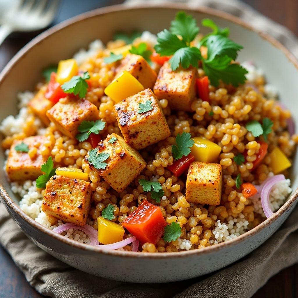 La quinoa ha sido un pilar nutricional para muchas culturas indígenas de Sudamérica por milenios. En los Estados Unidos, su popularidad creció significativamente debido a la creciente conciencia sobre alimentos saludables y sostenibles. Al combinarlo con tofu, un producto de soja de origen asiático, esta receta representa una fusión culinaria que celebra diversidad y nutrición.