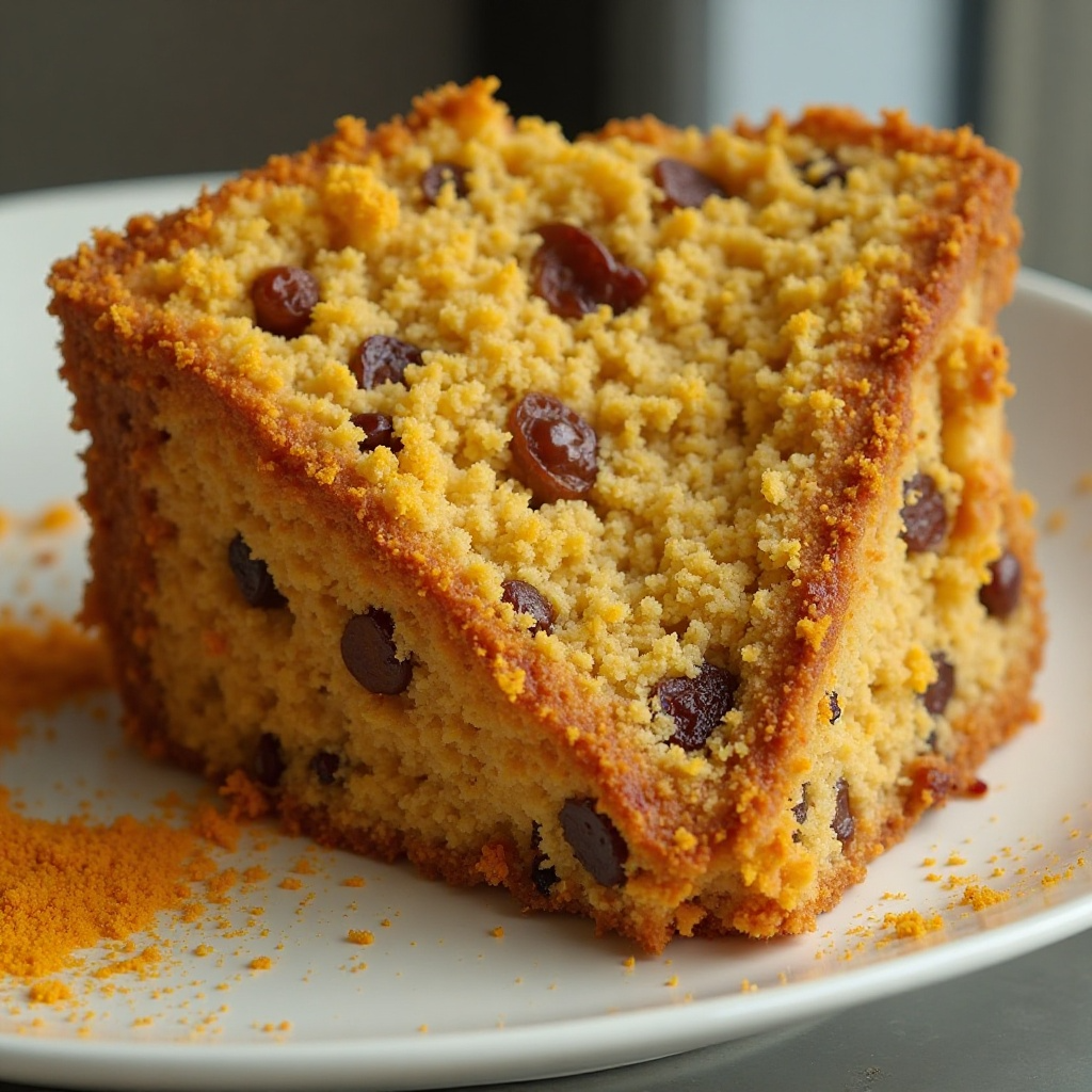 - Una vez que el pastel esté listo, retira del horno y deja enfriar antes de desmoldar. Corta en porciones y espolvorea con cúrcuma al gusto para darle un toque colorido.
