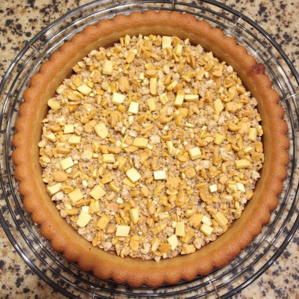 4. Coloca la masa en un molde para tartas previamente enharinado y extiende uniformemente, asegurándote de presionar las nueces en la superficie para un toque decorativo y crujiente.