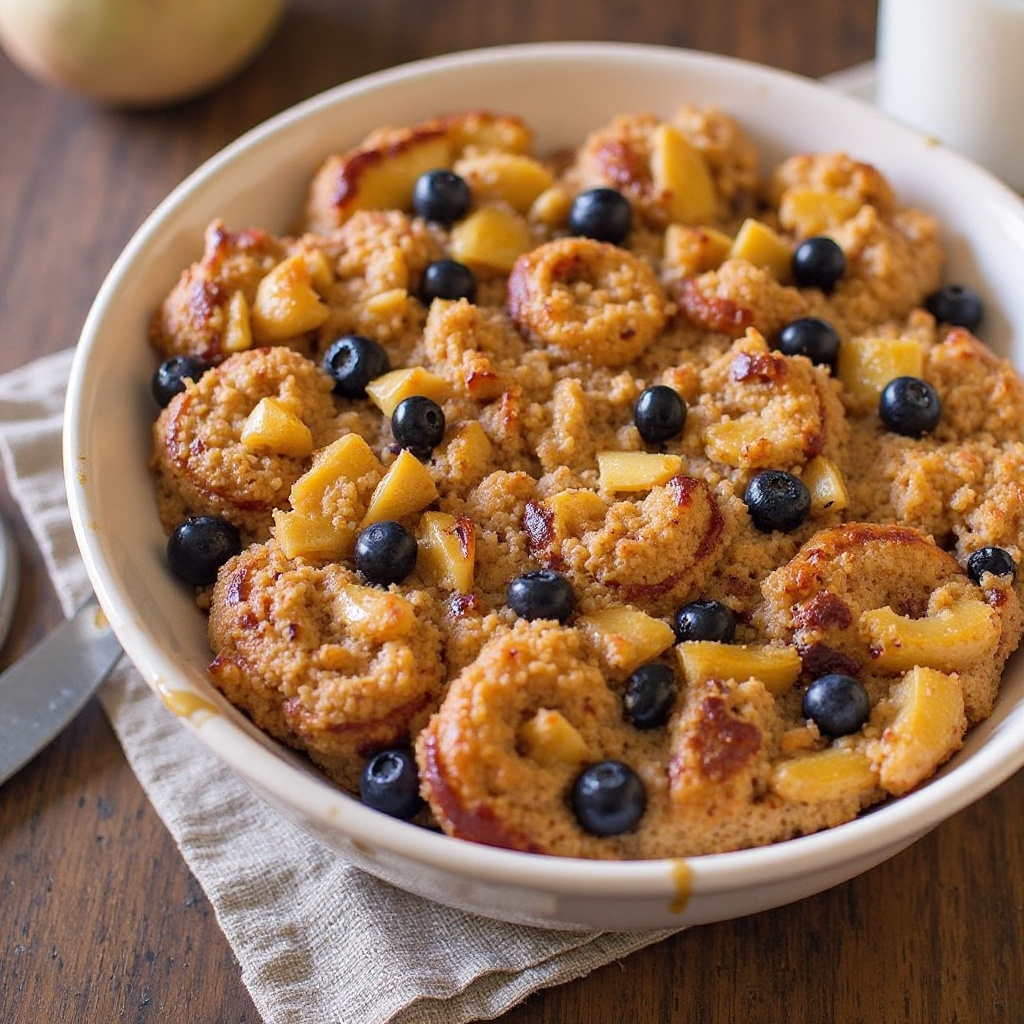 - Vierte el contenido en el molde o bandeja, asegurándote de que las frutas estén bien distribuidas. Hornea durante 25-30 minutos, hasta que el pan esté dorado y crujiente por fuera, y el interior suave al tocar.