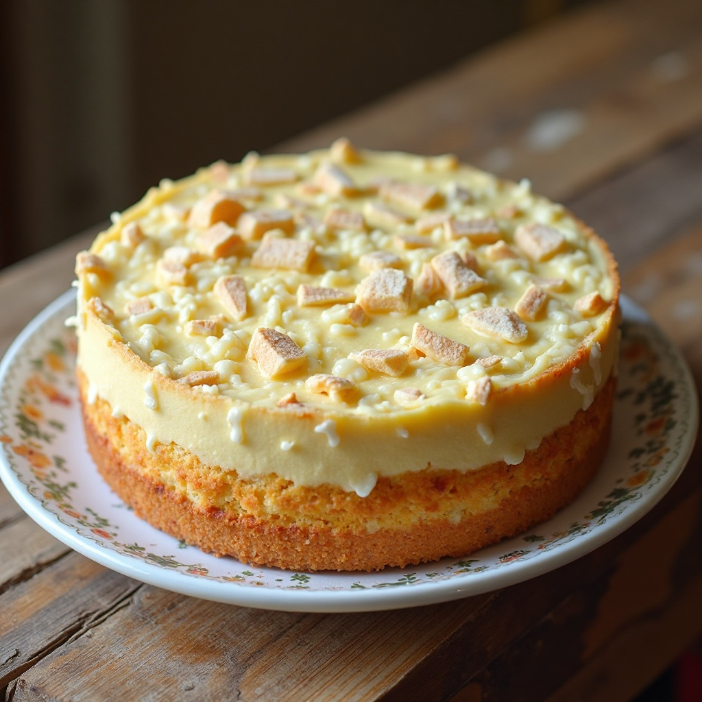 - Una vez horneada, saca la torta del horno y deja enfriar en el molde durante unos 15 minutos. Luego, transfiere cuidadosamente la torta a una bandeja plana y cubre la superficie con la crema pastelera. Deja reposar para que se adhiera bien.