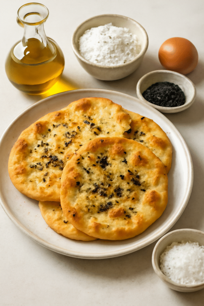 - Coloca una cucharadita de harina de garbanzo y semillas de sésamo negro sobre la superficie de cada torta. Añade un toque de sal marina y pimienta negra al gusto.