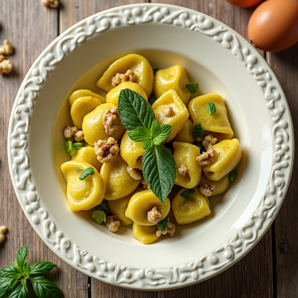Los tortelli di zucca son una especialidad tradicional de Reggio Emilia, una región de Italia conocida por su rica tradición culinaria. Estos pasta casera, hechos con calabaza (zucca en italiano), son perfectos para un almuerzo ligero o una cena reconfortante. En esta versión, servimos los tortelli con pesto alla Genovese, un toque que agrega un sabor único y fresco a este plato clásico.