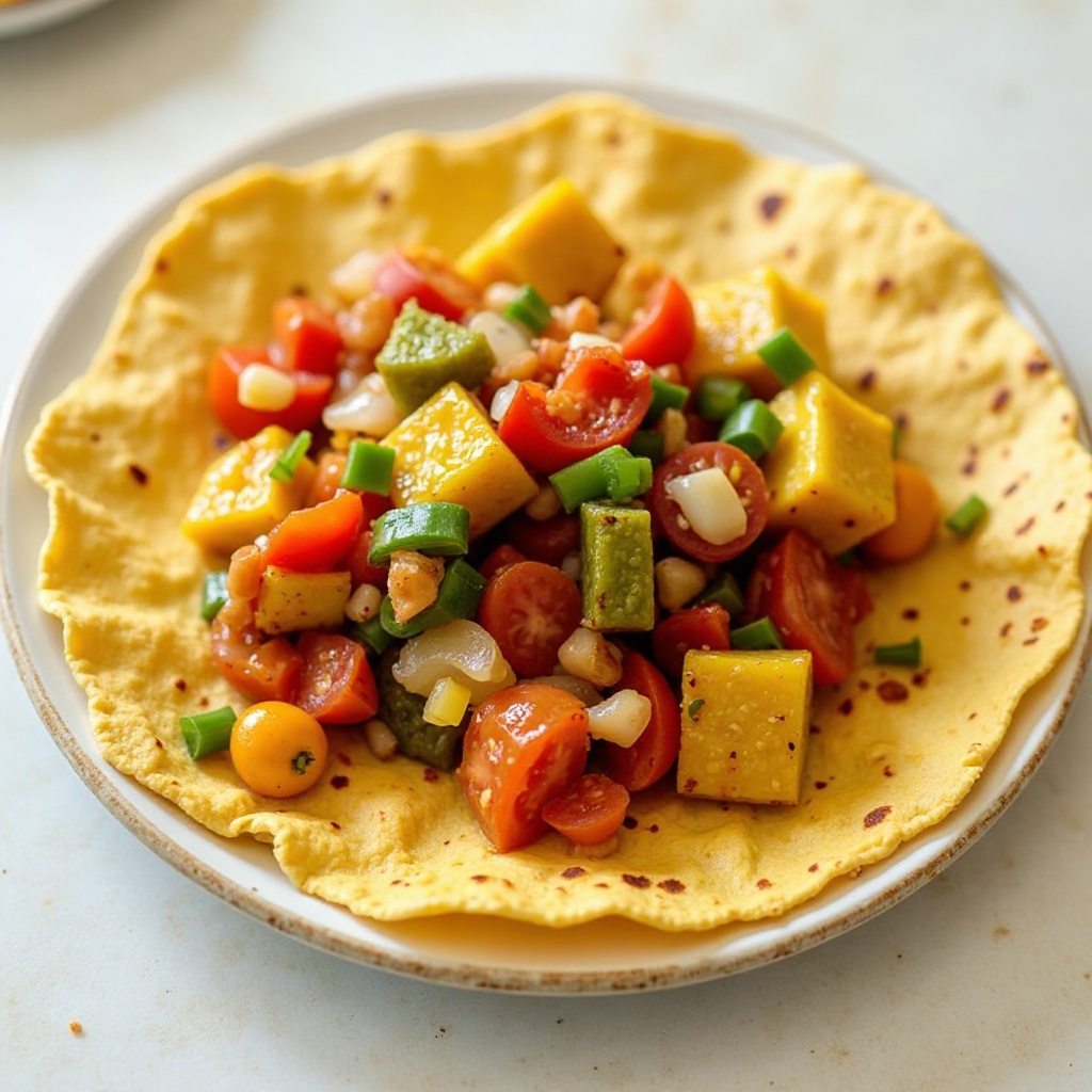 - Coloca una tortilla sobre la mezcla de verduras y charamuscas. Cubre con otra tortilla, asegurándote de que cubra completamente el relleno. Repite con las últimas tortillas.