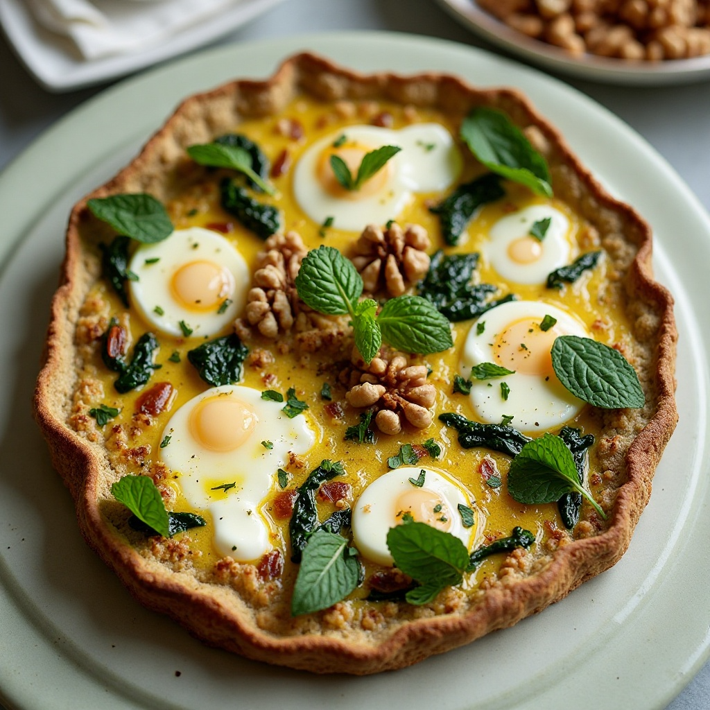 - Sirve la tortilla caliente, espolvoreada con nueces tostadas y hojas de menta fresca picadas. Añade un poco de vinagre de sidra de manzana o un toque de aceite de oliva virgen extra al gusto.