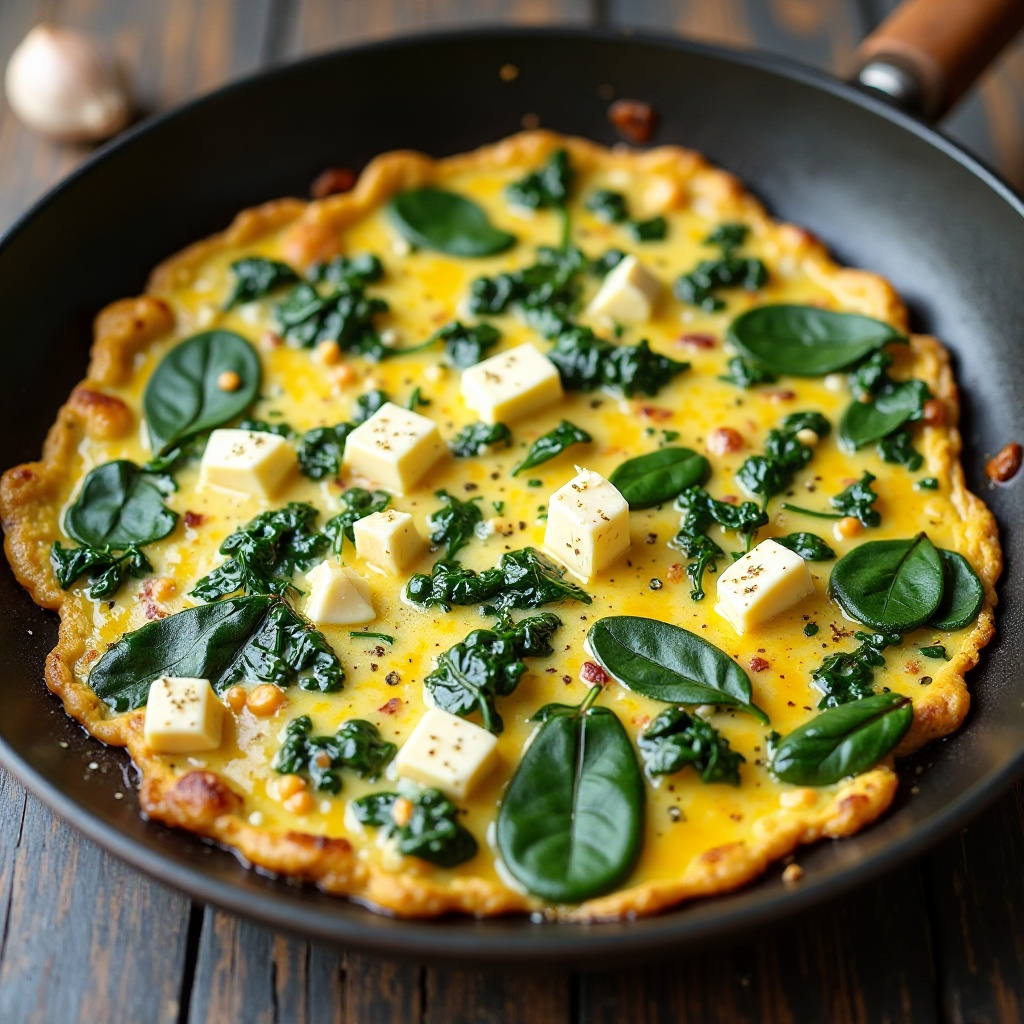 - Coloca el batido de huevo en la sartén con las espinacas y queso, asegurándote de que todo quede bien cubierto.