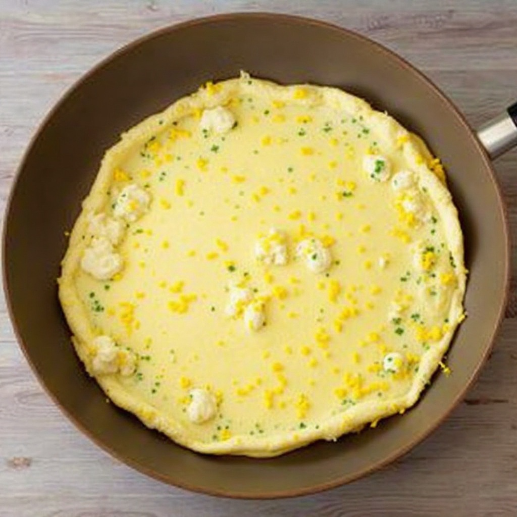- Vierte la mezcla de huevos y leche agria en la sartén, asegurándote de distribuir los ingredientes de queso de manera uniforme. Cocina a fuego medio-bajo, sin mover la tortilla, hasta que la parte inferior esté dorada (alrededor de 3 minutos).