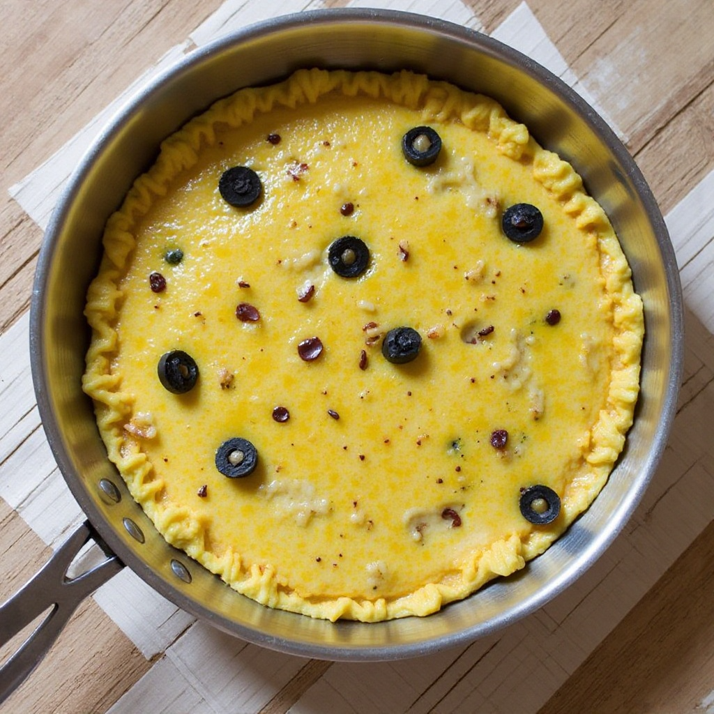 5. Calienta una sartén antiadherente a fuego medio-bajo. Vierta la mezcla de huevos, patatas, cebolla y aceitunas. Cocina lentamente hasta que la parte inferior esté dorada y firme, aproximadamente 5 minutos.