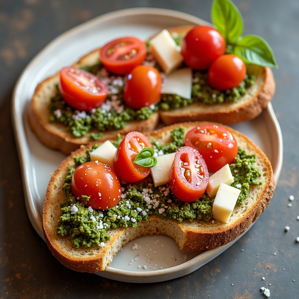 - Coloca una hoja de pesto sobre cada rebanada de pan tostado. Esparce los trozos de tomate cherry sobre el pesto.