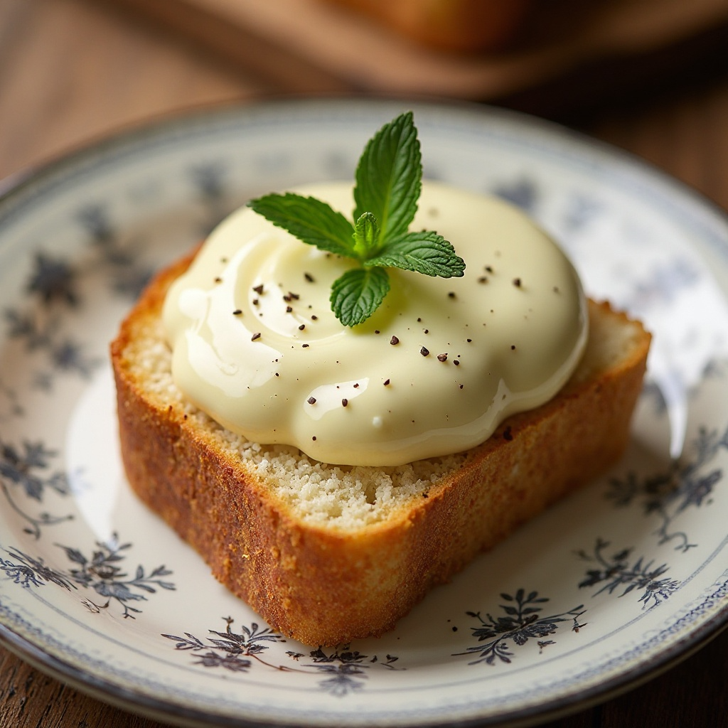 - Cubre la Tosta con una generosa capa de Crème Catalane tibia, asegurándote de que cubra todo el pan tostado. Si prefieres, puedes añadir unas pocas hojas de hierbabuena fresca picada para darle un toque fresco y verde.
