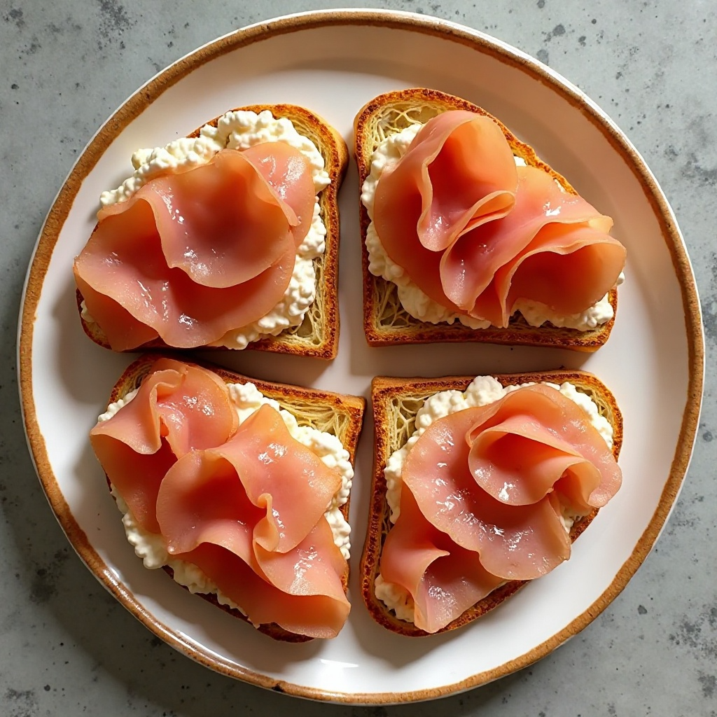 - Coloca las láminas de jamón ibérico cocinado sobre la miel y espolvorea ligeramente con sal y pimienta, si lo deseas. Sirve de inmediato para apreciar los sabores antes de que el pan se enfríe.