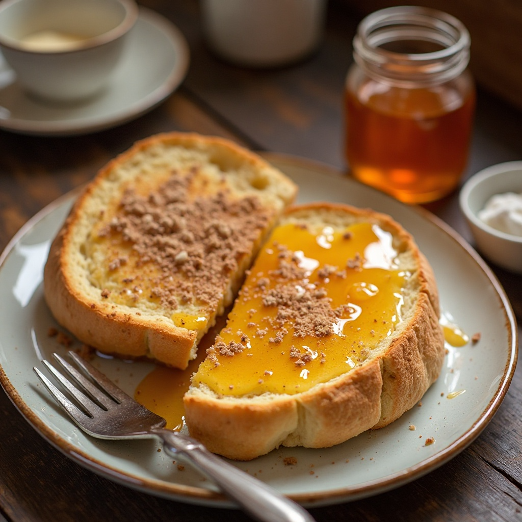 - Voltea la tostada para que la otra cara también reciba una capa de miel. Si la miel se derrama, no te preocupes, ya que el pan absorberá la miel gradualmente.