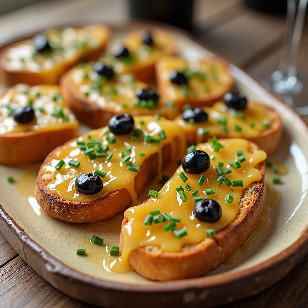- Coloca en cada una de las piezas un poco de aceituna picada y decora con unos trozos de cebollino fresco.