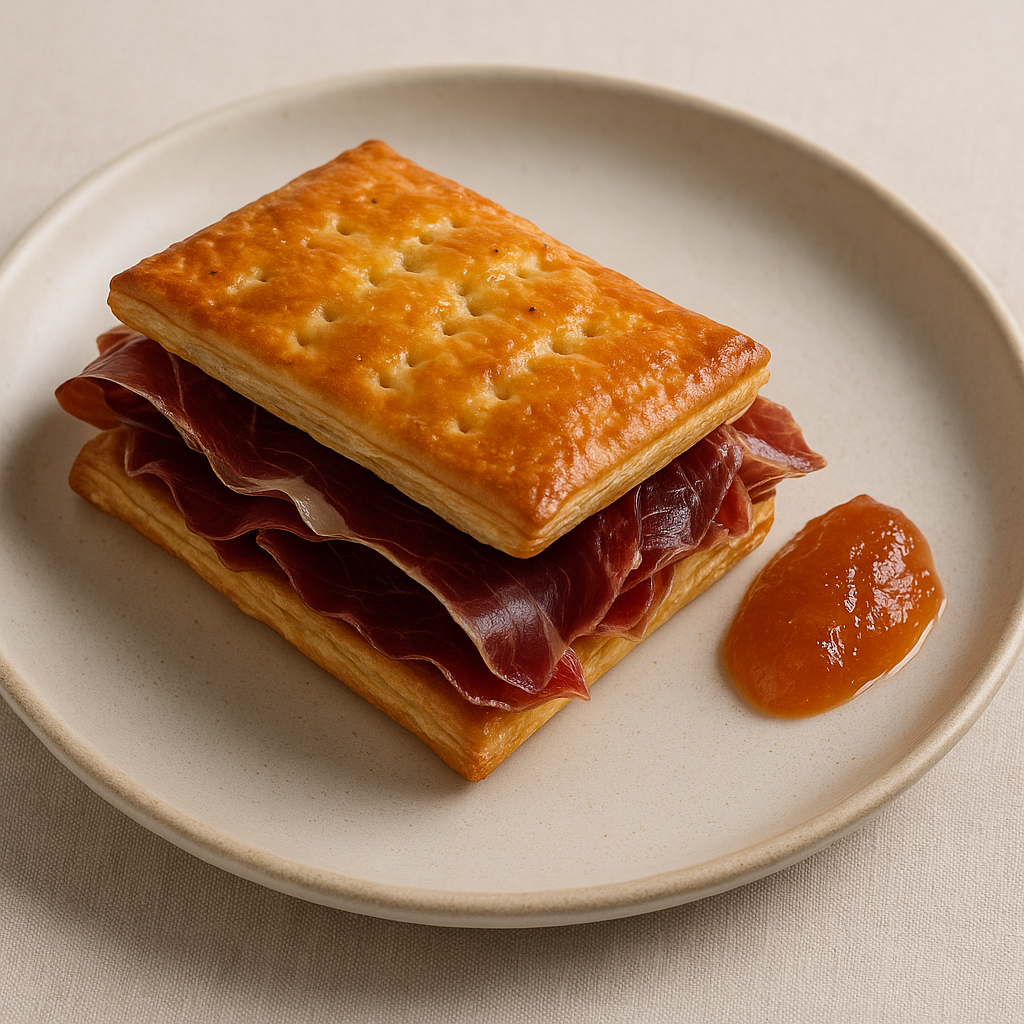 2. Mientras tanto, en un plato, coloca una rebanada de jamón ibérico sobre la masa del pionono.