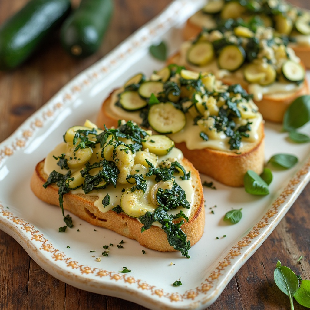 Este plato es nutritivo gracias a su contenido de vegetales y queso, que proporciona proteínas. Las espinacas son ricas en vitaminas y minerales esenciales. Para adaptar el plato a necesidades dietéticas específicas, considera usar queso bajo en grasa o sustituir las tostadas por opciones integrales. Además, asegurarse de que los calabacines se cocinen adecuadamente es crucial para matar cualquier bacteria potencial.