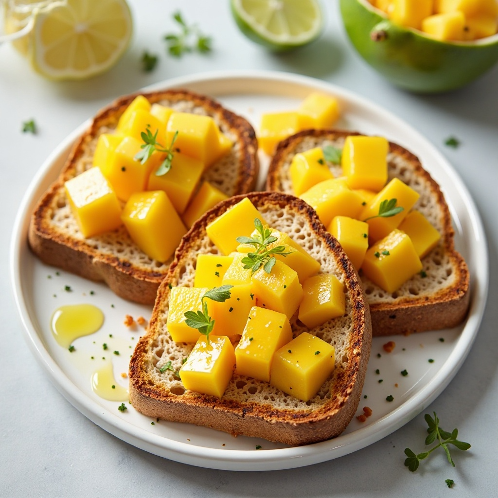 Esta receta es baja en calorías y rica en vitaminas, gracias al mango, que es una fuente de vitamina C y antioxidantes. La elección de tostadas integrales añade fibra a la dieta. Para una versión más ligera, puedes reducir el jugo de limón o usar un toque de zumo de limón regular en lugar del Key Lime Pie para quienes prefieren una opción menos dulce.