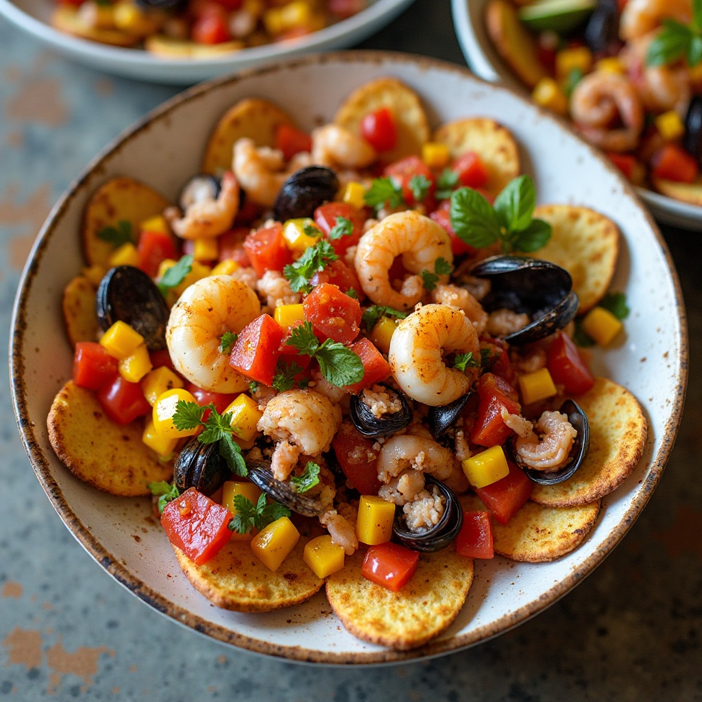 En las islas del Caribe, los tostones son un alimento versátil que se adapta a diferentes platos. Este toque especial de Cayo Coco, Cuba, presenta una combinación de mariscos frescos y el típico mojo de ajo, un aderezo ácido y picante que realza todos los sabores. Perfecto para disfrutar en una tarde soleada o en cualquier reunión familiar.
