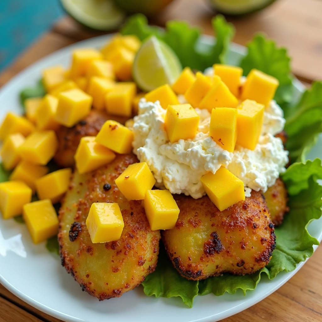 En la hermosa isla caribeña de Martinica, las frutas tropicales como el mango son estrellas principales de muchas recetas. Este plato combina tostones (plátanos fritos) con el frescor del mango y la cremosidad del queso crema, ofreciendo una explosión de sabores que capturan la esencia caribeña.