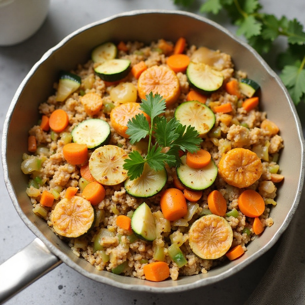 Este plato es una opción balanceada que reduce el contenido de grasa típico de la tourtière tradicional, al agregar verduras y harina integral. La carne de cerdo proporciona proteínas magras, mientras que las verduras aportan fibra y vitaminas esenciales. Reduce las porciones de aceite y considera sustituir el caldo de pollo por caldo de verduras para una versión aún más saludable.