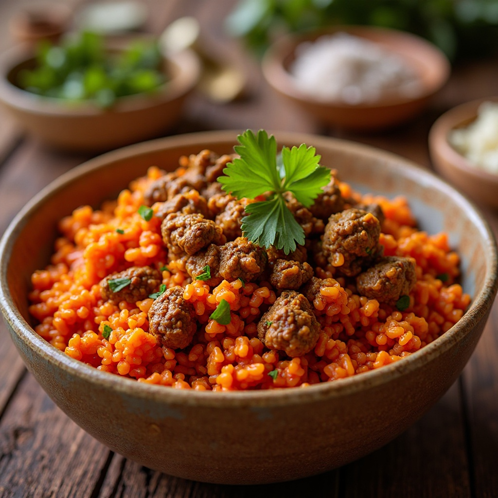El arroz rojo es rico en antioxidantes debido a su color vibrante. Incorporar carne de res en la receta proporciona proteínas esenciales. La cúrcuma, conocida por sus propiedades antiinflamatorias, añade un beneficio adicional. Si buscas una versión más saludable, considera usar carne magra o sustituir parte del arroz por una variedad integral.