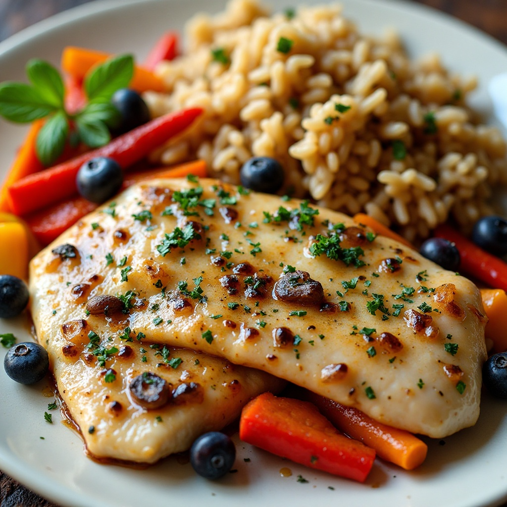 - Una vez cocida la trucha, retírala del fuego y deja que repose un momento. Sirve el arroz integral junto con los vegetales cocinados. Coloca un filete de trucha encima de cada porción de arroz. Espolvorea con las hierbas frescas y, si lo deseas, algunos arándanos frescos para un toque dulce.