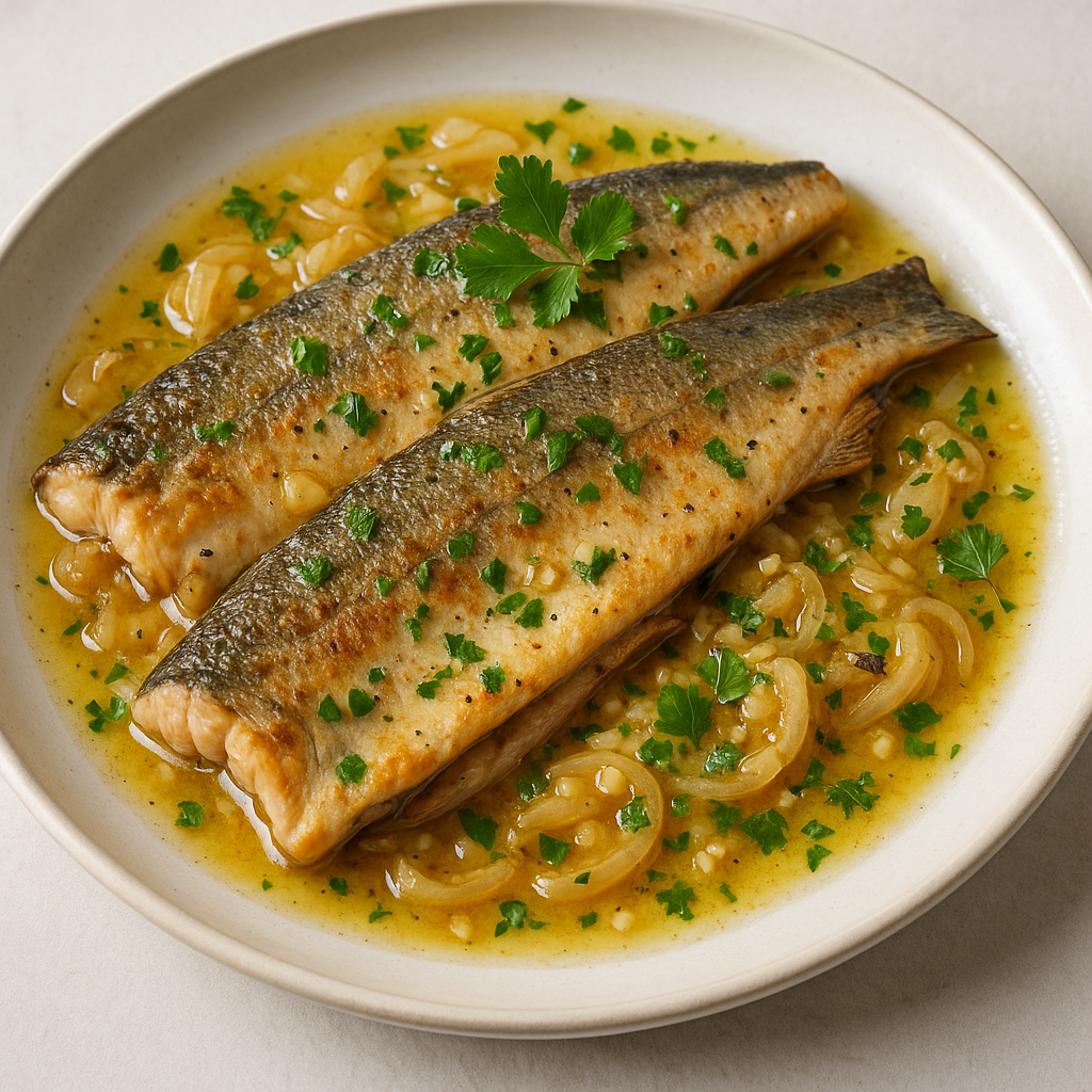 La trucha es una fuente excelente de proteínas, ácidos grasos omega-3 y minerales como el hierro y el zinc. La preparación al vapor o en salsa con ingredientes naturales como la cebolla asada y el perejil aporta un toque saludable al plato.