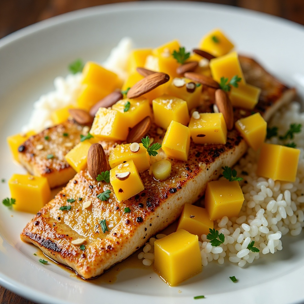 - Retira los filetes de la sartén, colócalos sobre platos individuales y rocía con el aderezo de mango y almendras.