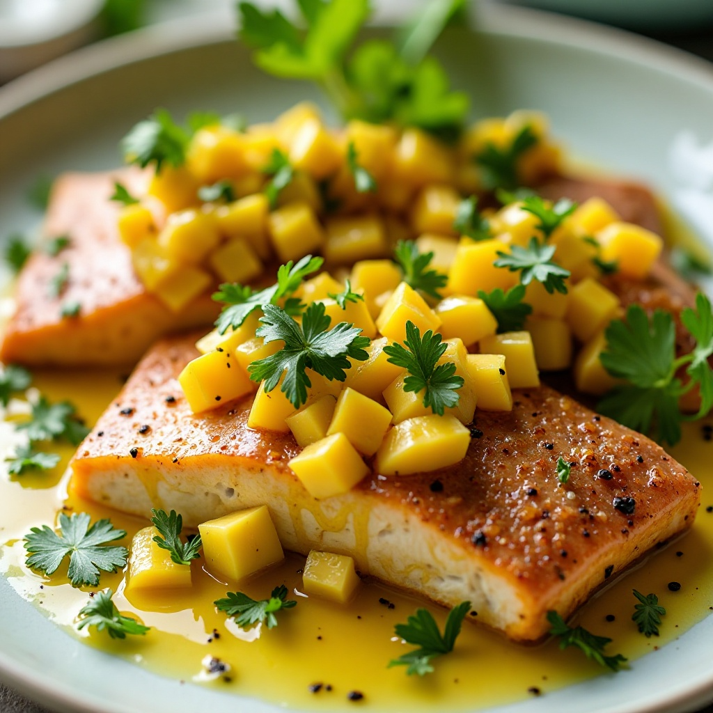 - Sirve la trucha caliente, cubriendo el exceso de salsa con más mezcla de mango y aguacate fresco. Decorar con hojas de hierbas frescas.