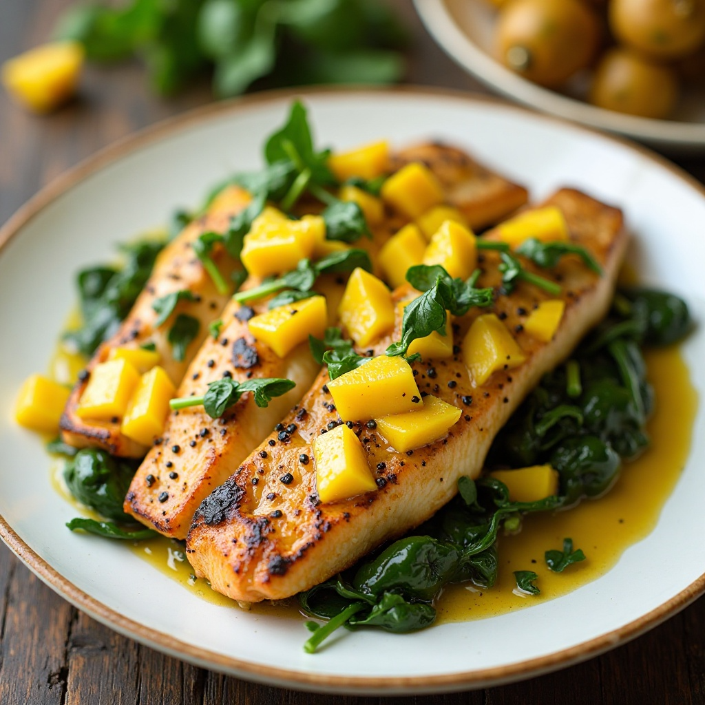 En Estados Unidos, la trucha arcoíris se cultiva y se pesca con frecuencia, siendo un ingrediente común en muchas recetas de cocina. Este plato refleja la fusión de sabores típicos del país: la frescura del pescado se combina con la dulzura del mango y la sabrosa textura de las espinacas. El uso de ingredientes locales y saludables hace que esta receta no solo sea deliciosa, sino también culturalmente relevante para muchas comunidades estadounidenses.