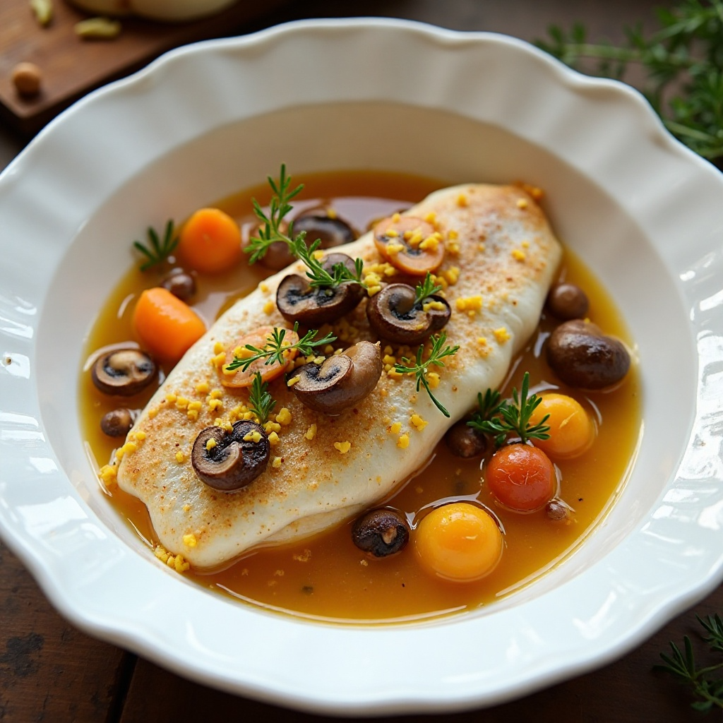 La cocina de Grenoble refleja la influencia de los ingredientes locales y las tradiciones de montaña. Usar trucha de Grenoble en una receta como esta es común, ya que representa el pescado de agua fría típico de la región. Este plato, con su combinación de sabores afrutados y champiñones, es un ejemplo de cómo la cocina de Isère incorpora elementos frescos y del bosque, destacando la rica biodiversidad de la región.
