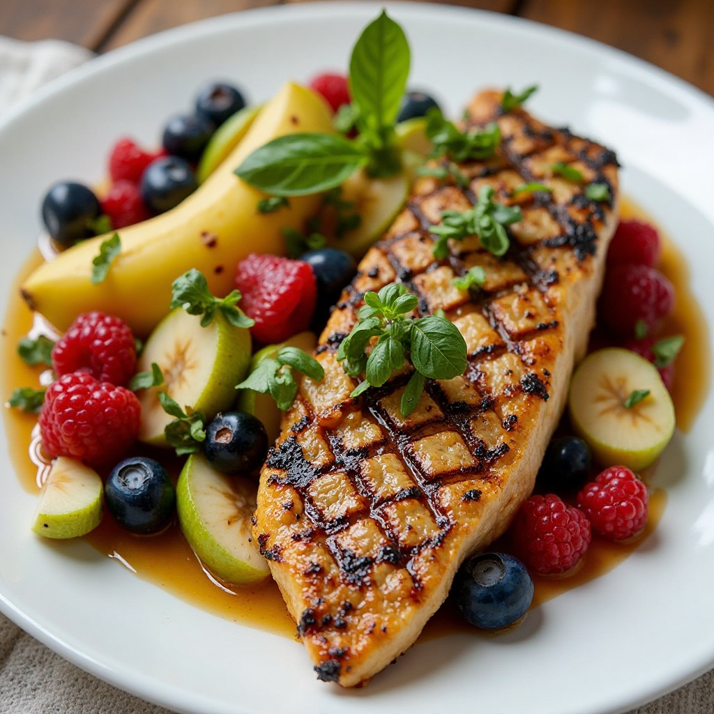 5. Sirve la trucha caliente sobre una cama de ensalada de frutas, espolvoreando con albahaca fresca picada para un toque fresco y final. Sirve inmediatamente, disfrutando del contraste de sabores y texturas.