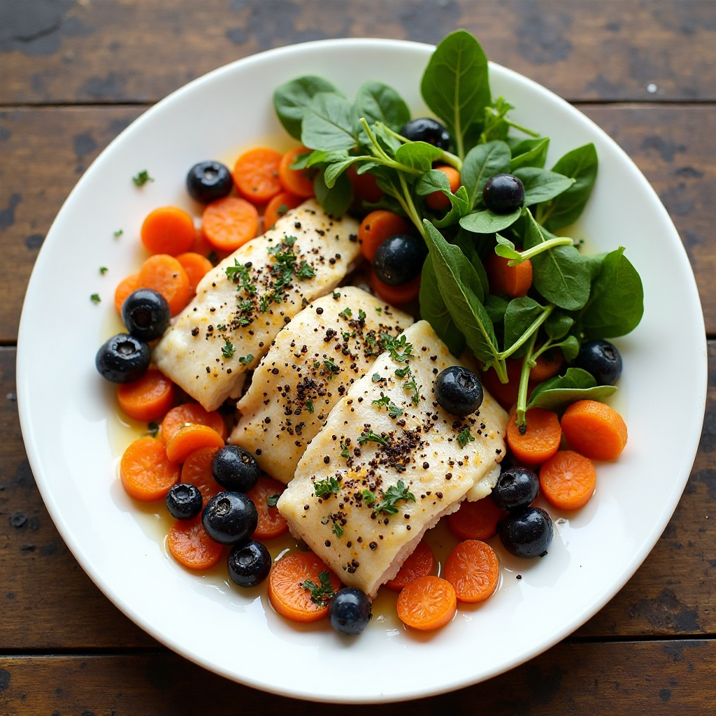 La trucha de montaña es una excelente fuente de proteínas magras y contiene ácidos grasos omega-3 beneficiosos para la salud del corazón. La ensalada de espinacas y arándanos aporta fibra y antioxidantes, contribuyendo a una dieta equilibrada. Si prefieres un plato más ligero, puedes reducir el aceite en la preparación de las verduras o optar por una vinagreta sin mantequilla.
