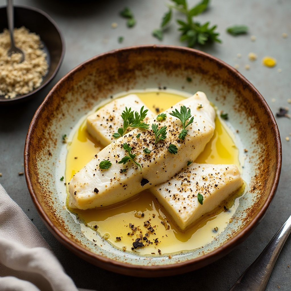 - Sirve los filetes de pescado caliente, bañados en la mezcla de ajo y aceite de trufa, decorando con un poco más de aceite de trufa si lo deseas.
